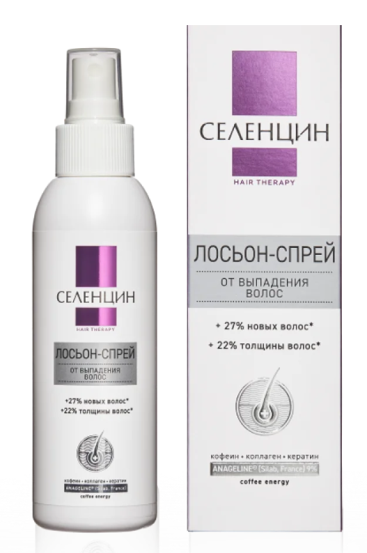 Укрепляющий лосьон-спрей Селенцин "Hair Therapy" — уникальный лосьон на основе французского запатентованного комплекса Anageline®, рекомендуемый для предотвращения хронического, длительного выпадения и поредения волос, для укрепления и восстановления жизненного цикла волосяных фолликулов. Является одним из лучших средств для ухода за выпадающими, ломкими, секущимися и истонченными волосами. Улучшая микроциркуляцию крови и доставку питательных веществ непосредственно к корням волос, укрепляет корни, увеличивает диаметр каждого волоса и количество волос в стадии роста, препятствует выпадению тонких пушковых волос, переводя их во взрослую здоровую фазу.